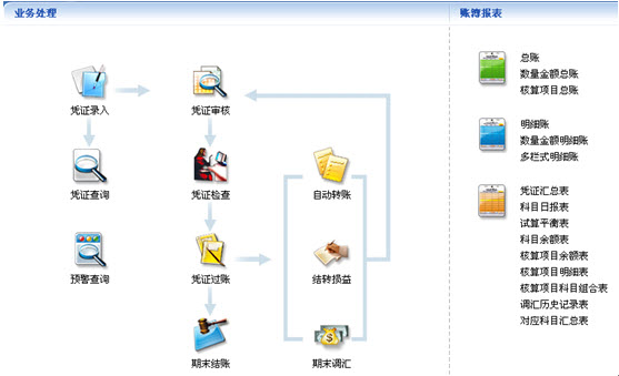 賬務(wù)處理是以“證—賬—表”為核心的有關(guān)企業(yè)財(cái)務(wù)信息加工系統(tǒng),包含憑證處理、期末處理和賬簿報(bào)表查詢?nèi)竽K,會(huì)計(jì)人員根據(jù)嚴(yán)謹(jǐn)?shù)呢?cái)務(wù)流程實(shí)現(xiàn)自動(dòng)轉(zhuǎn)賬、期末調(diào)匯、期末結(jié)賬和統(tǒng)計(jì)打印相關(guān)的憑證報(bào)表數(shù)據(jù),做到輕松工作,快速響應(yīng)。