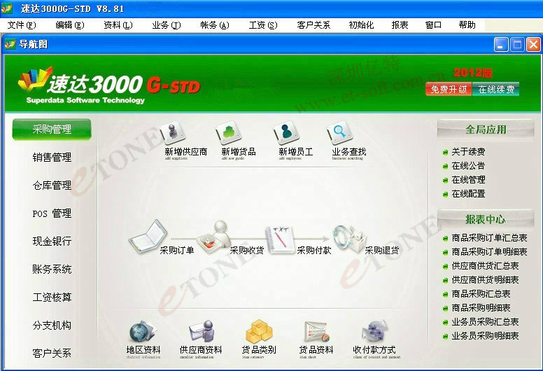 《速達3000 G-STD 》是一款集進銷存、財務(wù)、POS、CRM為一體的集成化企業(yè)信息管理系統(tǒng)。軟件界面簡潔,功能完善,有效幫助企業(yè)處理日常經(jīng)營管理業(yè)務(wù),協(xié)調(diào)業(yè)務(wù)流轉(zhuǎn)過程。系統(tǒng)融入新 一代全局應(yīng)用技術(shù),支持互聯(lián)網(wǎng)/局域網(wǎng)多用戶應(yīng)用,支持異地多機構(gòu)、多店面、多倉庫遠(yuǎn)程應(yīng)用,支持?jǐn)?shù)據(jù)實時同步管理和移動辦公,安全穩(wěn)定、高速,易實施維護,特別適合中小企業(yè)使用 。