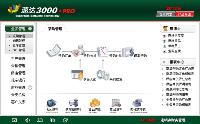 《速達(dá)3000G-PRO工業(yè)版》集進(jìn)銷存、POS、財務(wù)、CRM、生產(chǎn)為一體的中小企業(yè)管理軟件系統(tǒng)。系統(tǒng)采用導(dǎo)航式界面,易學(xué)易用、功能強(qiáng)大,是幫助中小企業(yè)規(guī)范經(jīng)營管理、財務(wù)管理的有效工具。系統(tǒng)支持局域網(wǎng)/互聯(lián)網(wǎng)多用戶應(yīng)用,實現(xiàn)異地多機(jī)構(gòu)、多店面、多倉庫等遠(yuǎn)程應(yīng)用,支持Android移動終端應(yīng)用,數(shù)據(jù)實時同步,安全、穩(wěn)定、高效、易維護(hù),特別適合中小企業(yè)使用。