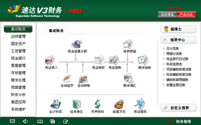 《速達(dá)V3-財(cái)務(wù)PRO》作為高端財(cái)務(wù)管理軟件,完全符合國(guó)家現(xiàn)行會(huì)計(jì)制度標(biāo)準(zhǔn)。功能強(qiáng)大、易學(xué)易用。產(chǎn)品集財(cái)務(wù)管理、出納管理、票據(jù)管理、工資管理、固定資產(chǎn)管理、存貨管理、壞賬管理、預(yù)算管理、合并報(bào)表、自定義報(bào)表于一體。特別適合中型企業(yè)使用。